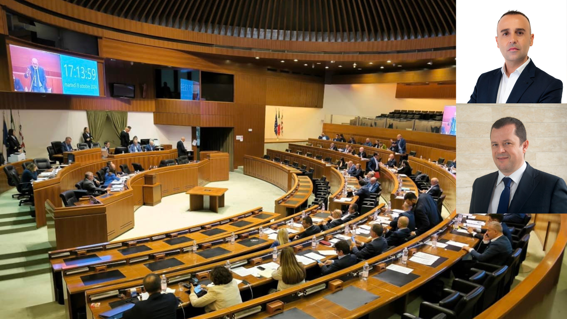 L’aula del Consiglio regionale; in alto Sandro Porcu e Stefano Tunis