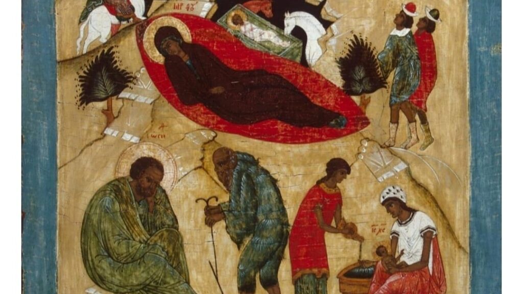 La Madre di Dio è molto particolare in questa icona. Distesa a terra su un materasso rosso e prezioso subito dopo il parto sembra quasi assente, distaccata. Lei invita: posate lo sguardo su questo figlio appena nato, posate lo sguardo su Dio!Il suo è proprio l’atteggiamento di chi medita profondamente gli eventi, la storia, come dice Luca nell’Evangelo. In alto il cielo si apre, si squarcia come canteremo nella novena di Natale, e irrompe la potenza dell’Altissimo.